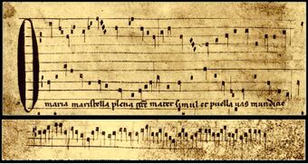 Composición musical coral en latín, generalmente de un movimiento.Inicio del motete _O Maria maris stella_ en el Códice de Las Huelgas (fol. 102v, ca. 1300). Se distinguen las voces superiores con ...