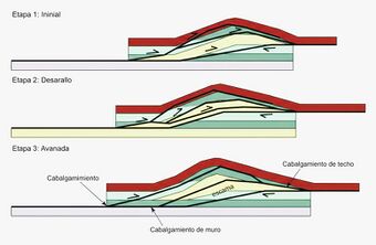 Estructura tectónica especialmente relevante en la formación de grandes cordilleras y zonas de deformación por compresión.Desarrollo de un cabalgamiento doble (dúplex) por fallados sucesivos en rampa ...